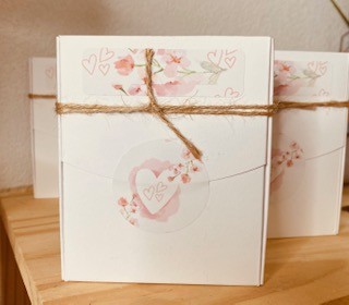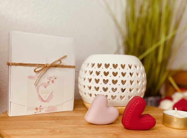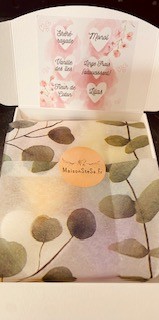 6 fondants parfumés en forme de coeurs de +/-14 grammes chacun dans un joli coffret en carton blanc, décoré selon la saison.