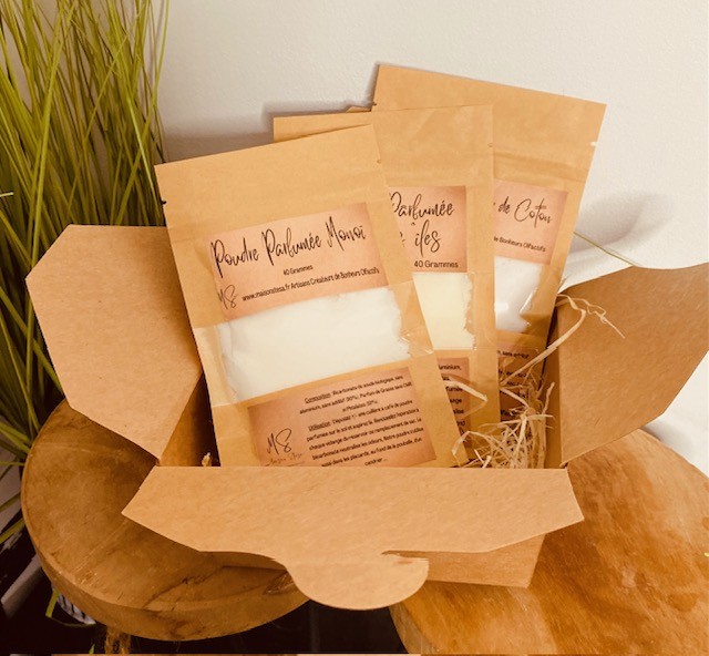 Un ballotin de poudre parfumée qui contient 3 sachets de poudre parfumée aux parfums de Noël (Sapin, Cannelle, Pain d'épices & figue)