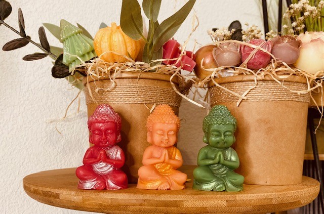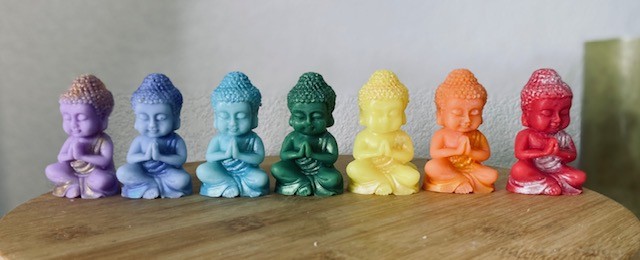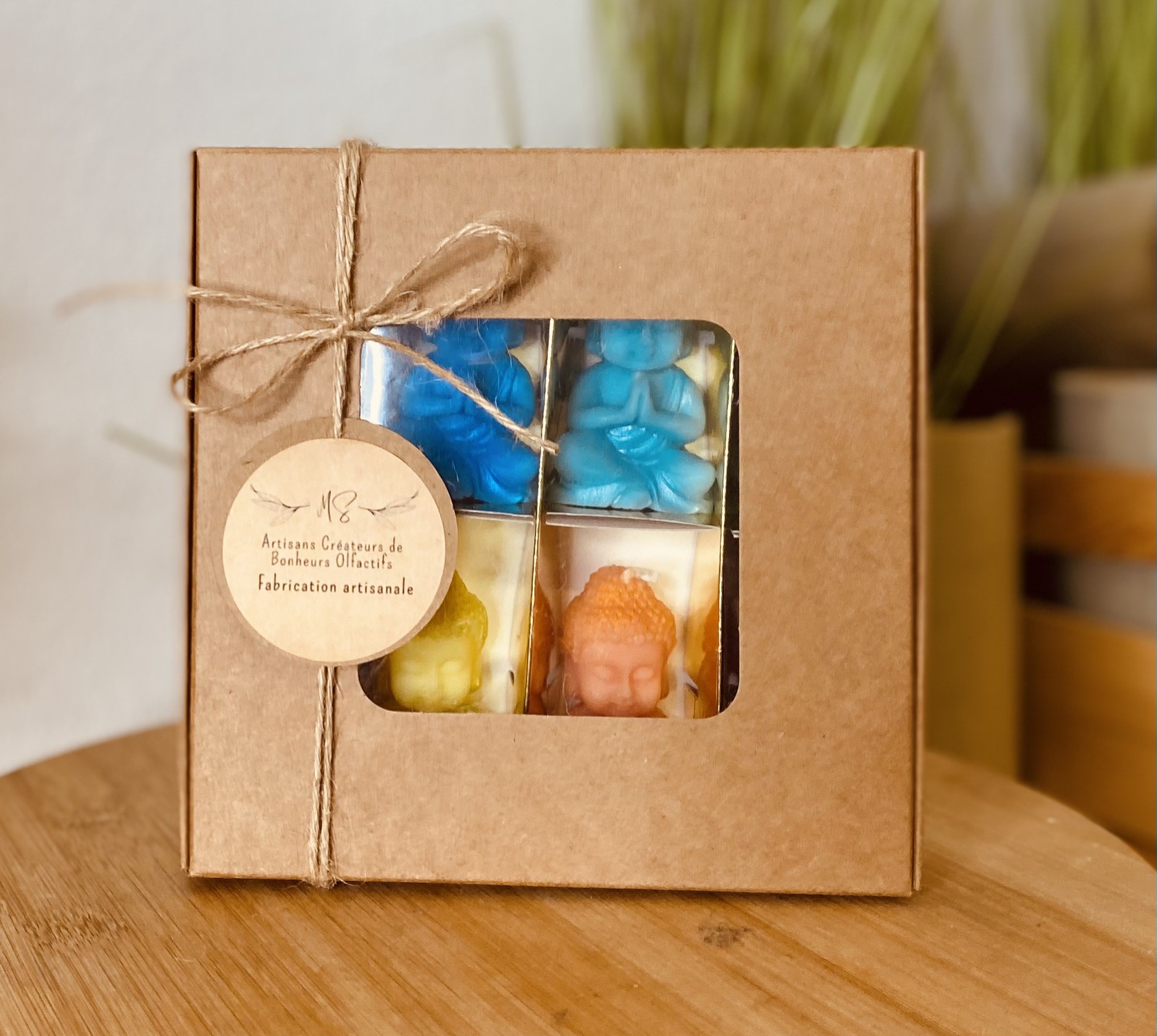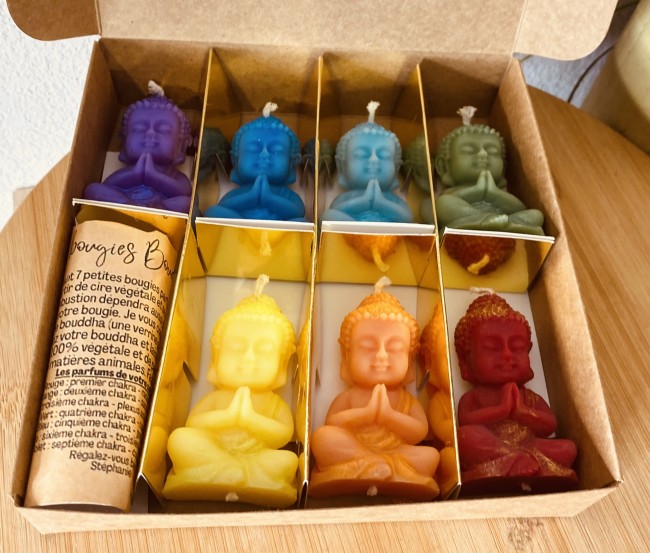 Un joli coffret contenant 7 fondants en forme de bouddhas, aux couleurs des 7 chakras.