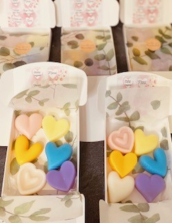 6 fondants parfumés en forme de coeurs de +/-14 grammes chacun dans un joli coffret en carton blanc.